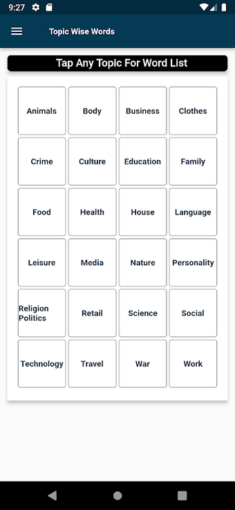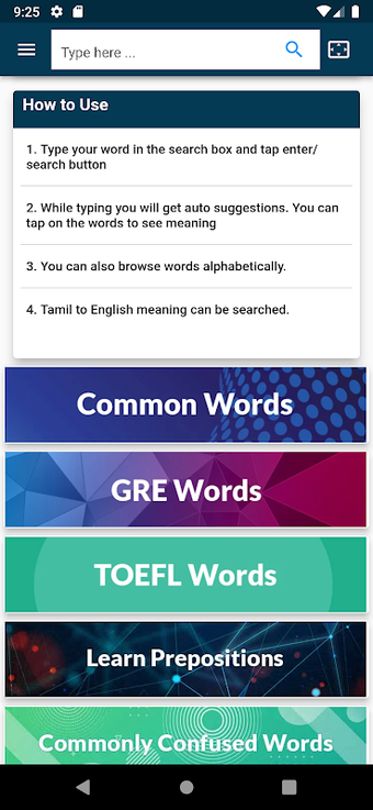 Aplikasi kamus gratis ini memungkinkan Anda mencari arti kata bahasa Inggris dengan cara yang paling nyaman. Yang harus Anda lakukan adalah mengetuk kata yang ingin Anda ketahui artinya, dan aplikasi akan segera memberi Anda arti dan daftar kata terkait. Ini adalah kamus yang sangat sederhana dan mudah digunakan, yang sangat cocok untuk orang yang ingin belajar bahasa Inggris. Itu dapat diunduh di perangkat Android.